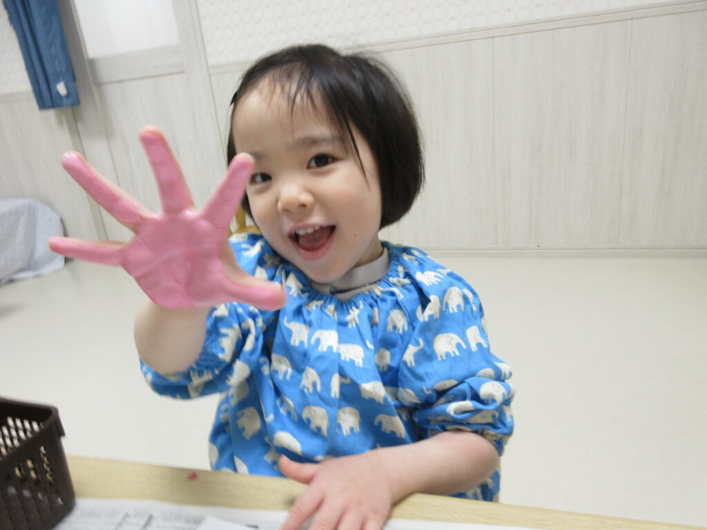 手と足に絵の具を塗り